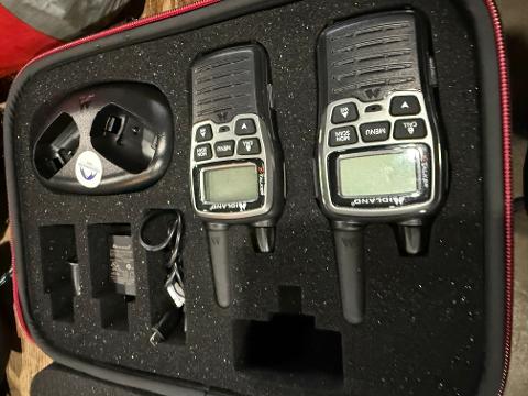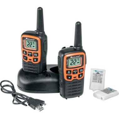 When your hunting party sets up camp deep in the backcountry, take along the Midland Outfitter radios for crystal-clear reception, transmission and sound quality from up to 38 miles away. All radios feature 36 channels with 14 extra channels and 122 privacy codes that eliminate interference. Channel-scan feature monitors activity over all channels, and Midland's Weather Alert technology keeps you on top of any drastic changes in the weather. Hi/low power option lets you maximize range or conserve the battery. Silent mode works with headphones (not included) or eVOX with variable voice sensitivity adds hands-free use. Battery meter with low-battery indicator. Rapid Charge charges batteries in less than three hours. Water-resistant radios come equipped with a headphone jack, keystroke tones and roger beep. Pack includes: four radios, eight rechargeable battery packs, a micro-USB charging cable, USB Y-cable, car charger, AC wall adapter, desktop charger and four headsets.