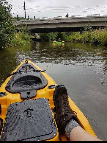Perfect size kayak for your weekend adventure. Super stable and even has a standing platform. It is very wide and has a 325 pound weight capacity. Easy to handle, paddle and store. Many customers enjoy floating this down Campbell Creek or take it to local lakes. Easy to toss in the back of a truck or strap on the top of a car.