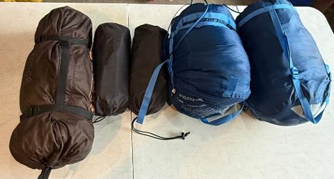 PKG Backcountry 2 Person u/l Tent, 2- 20deg Bags/ 2 U/L Sleep Pads/2 Backpacks w/Rain Cover, 1 Bear Keg,1 Bear Spray Backpacker Stove, (2 People) 2 Pairs Trekking Poles